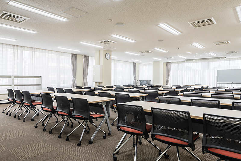 角部屋のため窓が2面(換気可能な窓が6ヶ所)にある明るい雰囲気の会議室です。60名程度の中規模なセミナー・講習会や40名程度の会議に最適です。有線LAN・Wi-Fiの利用が可能であり、リアル/オンラインのハイブリット型イベントの開催も可能です。